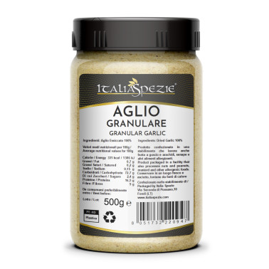 Pratico e facile da usare, l'aglio granulare è confezionato in un comodo barattolo PET, disponibile nei formati da 180 g e 280 g. Il barattolo è leggero, resistente e riutilizzabile, una soluzione perfetta per ridurre gli sprechi e dare nuova vita ai tuoi contenitori. Per chi cerca ancora più convenienza, è disponibile anche in sacchetti da 1 kg, perfetti per chi ama cucinare in grandi quantità. Aquista ora!