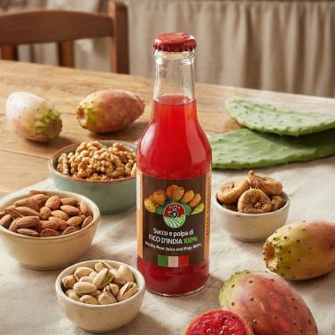 No, il succo è ottenuto esclusivamente dalla spremitura del fico d’India, senza aggiunta di acqua o zuccheri.