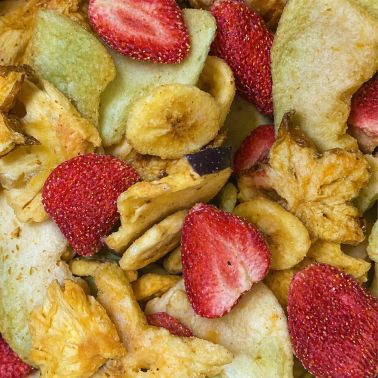 La combinazione degli ingredienti crea un equilibrio armonioso tra note dolci, fresche e leggermente esotiche. La banana e la mela donano rotondità, l’ananas aggiunge una sfumatura vivace e tropicale, mentre il melone verde apporta una dolcezza delicata. La carambola regala una nota più particolare e raffinata, completata dalla fragola che arricchisce il mix con il suo tocco fruttato e profumato. Il risultato è uno snack colorato, profumato e versatile, adatto a ogni momento della giornata o come ingrediente creativo in cucina.